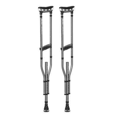Lighter than wood, the standard underarm aluminum crutch provides stability and durability. Double extruded center tube provides additional strength to weight-bearing area. Push-pin adjustment makes it easy to adjust crutch height in 1" increments. Non-skid, jumbo size vinyl contoured tips provide excellent traction. Easy wing nut adjustments for hand grips. Adult size crutches for user height 5'2" - 5'10". Weight capacity: 350 lb.