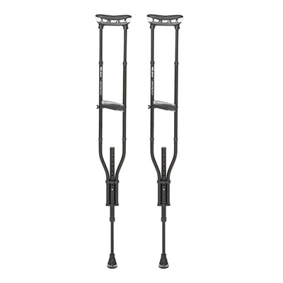 Lighter than wood, this walking crutch by Drive Medical provides stability and durability. Each crutch is manufactured with a double extruded center tube to ensure additional strength on weight-bearing areas. Extra thick (latex free) underarm pads and hand grips provide maximum comfort when in use. Tool free push-button adjustment allows the height of the underarm pad to be easily adjusted in 1" increments. Hand grips adjust separately without tools to ensure a proper fit.