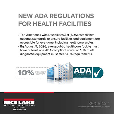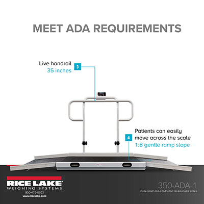 Rice Lake's 350-ADA-1 is designed with accessibility and precision in mind. This ADA-compliant wheelchair scale provides safe, accurate weighing for patients, including those with mobility challenges. The low-profile ramps and spacious platform make transfers easy and stress free, while the sturdy construction ensures long-lasting reliability in any clinical or healthcare setting. FEATURES: ADA-compliant dual ramp, Large LCD display, Antimicrobial keypad, Metal nonslip platform, Supports bariatric patient weighing, 2-in edge protectio, 1:8 gentle slope, Two wheels for easy transport, Motiontrap movement compensation technology, Unit of measure toggle or locking, EMR capable, Serial and USB data communication ports, Tare function, Hold function, Body mass index (BMI) function, Factory calibrated, Easy to store folded depth is 11.75 in (29.8 cm).