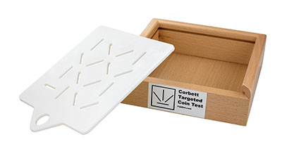 The Corbett Targeted Coin Test Box assess palm to fingertip In-Hand Manipulation (IHM). The test requires translating coins from palm to fingertips before coin insertion in vertically as well as randomly positioned slots. This skill requires a more complex visual-motor, differential tendon glide and proprioceptive coordination than most pegboards tests. Clinicians can observe recovery of shift, rotation and translation of IHM of their patients. With qualitative and quantitative reporting, clinicians can assess Fine Motor Manipulation (FMM) and Dart Thrower's Motion (DTM). This consistent and convenient test box is easy to clean. It relates to meaningful manipulatives such as coins, buttons, earrings, bingo chips, snack foods.