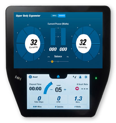 Introducing the UE8 Pro from NuStep! The first upper body ergometer to combine both a swivel drive train and integrated sensor technology all in one inclusive product. The featured swivel drive train has a bi-directional operation and is designed for ease of access. Choose to exercise from three unique positions including: seated, standing and in a wheelchair - without seat removal. The HD dual touch screen display is easy to read and offers performance metrics that are easy-to-understand. The intuitive software integrated into the display features engaging workout apps and force sensor technology. With 15 levels of resistance, you can set your resistance and get going. The ergonomically designed seat is so comfortable is features a contoured back that swivels 360 degrees and reclines an additional 12 degrees for maximum adjustability. The seat is 22" wide and can support users up to 600 lbs. The sturdy metal construction of the Grab Ring provides additional support and stability for all users. It is now standard across all NuStep models, allowing users to safely get on and off with ease.