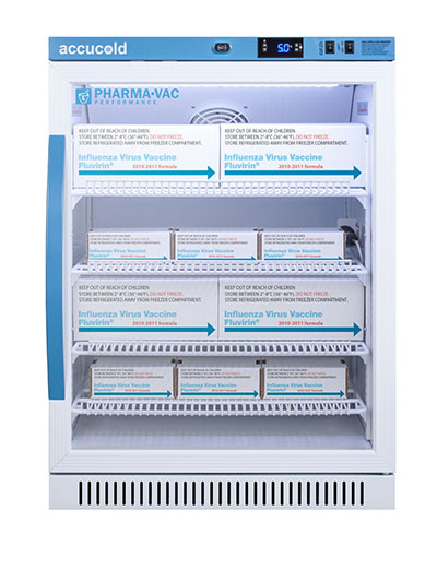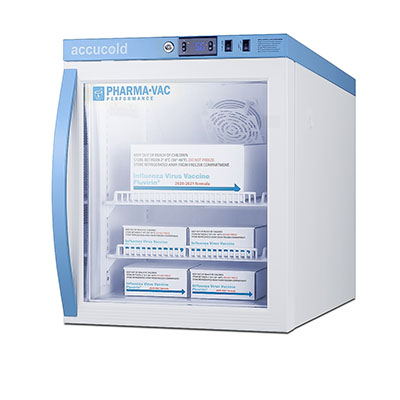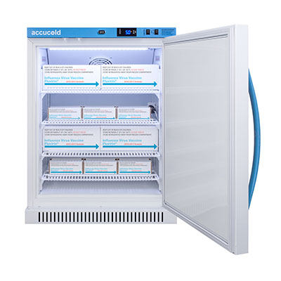Accucold's Pharma-Vac Performance Series are upright all-refrigerators designed and purpose-built for pharmacy, medication, and vaccine applications to support meeting CDC/VFC/VFA guidelines, with a powder-coated silver ion handle that helps prevent germ spread. The ARG6PV is a 6 cu.ft. all-refrigerator sized at 32.5 inches high for use in most ADA compliant applications. The adjustable control range allows you to manage the temperature between +2 to +8 degrees Celsius. The microprocessor temperature controller is externally located to minimize door openings, helping to protect stored contents from ambient temperature. The buffered temperature probe is encased in a glycol-filled bottle to better simulate temperature of the stored product, with an additional sensor that reads air temperature to ensure superior temperature control. The current and min/max temperature display is viewable in Celsius or Fahrenheit to the nearest tenth of a degree. The audible and visual temperature alarm sounds if the unit's interior goes out of range. Additional alarms include a power failure alert, door open alarm, and sensor failure alarm. This unit is equipped with remote alarm contacts in the rear and a 1/2" probe port on the right side to accept additional monitoring devices. A hospital grade cord with 'green dot' plug is also included for added safety in high traffic areas. Inside, the ARG6PV utilizes adjustable cycle defrost operation to avoid temperature spikes. Optimized forced air cooling with an internal fan to ensure excellent temperature stability and uniformity with rapid recovery after door openings. The adjustable plastic-coated wire shelves can be positioned at 1/2" increments to accommodate virtually any sized item. This unit includes LED internal lighting with an on/off rocker switch. The interior is constructed from white powder coated metal to ensure added durability and better temperature retention. The ARG6PV comes in a white cabinet finish with a blue accented control panel. The factory-installed antimicrobial handle is powder-coated with naturally occurring silver ions, which help to reduce the spread of germs, allowing for a safer, cleaner user experience. The double pane tempered glass door provides a full view of the interior. The user-reversible door ships with a right hand swing and self-closing function. This model includes a factory-installed lock and ships with two keys for staff use. Powerful magnetic gaskets ensure a positive seal. Designed with hydrocarbon refrigerant, the ARG6PV provides an energy efficient solution to vaccine storage. This unit is Pyxis, Omnicell, and AcuDose RX compatible. Additional sizes, as well as solid door options, are also available. Explore the full Pharma-Vac series at accucold.com/pharmavac. NOTE: Accucold refrigerators are purpose-built to the support meeting the current CDC (Centers for Disease Control) guidelines for the storage of vaccines. Units that end in suffix "456" have been certified to the new NSF 456 standard. As referenced in the current Vaccine Storage and Handling Toolkit, these units incorporate microprocessor controls and forced air circulation for stable operation between 2 and 8 degrees Celsius. For additional temperature assurance, the CDC recommends a calibrated digital data logger (DDL), which can be added with the factory-installed option DL2B or addition of the DL2BKit accessory.