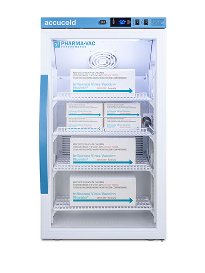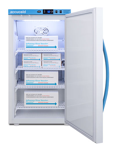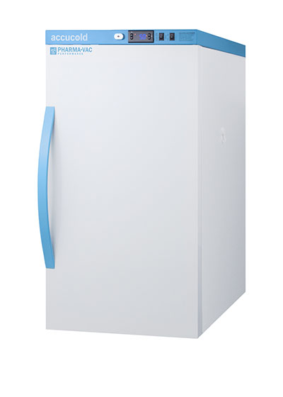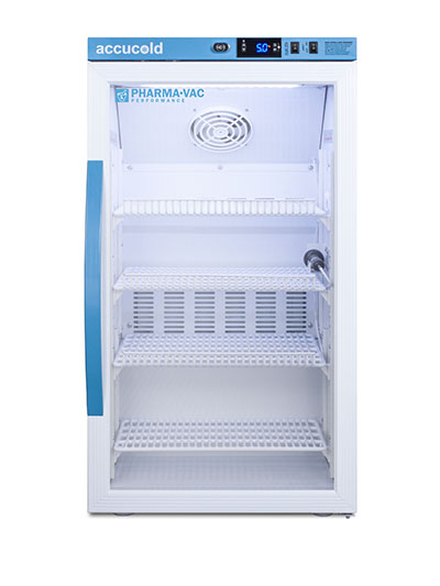 Accucold's Pharma-Vac Performance Series are upright all-refrigerators designed and purpose-built for pharmacy, medication, and vaccine applications to support meeting CDC/VFC/VFA guidelines. The ARS3PV is a 3 cu.ft. all-refrigerator with an adjustable control range from +2 to +8 degrees Celsius. The microprocessor temperature controller is externally located to minimize door openings, helping to protect stored contents from ambient temperature. The buffered temperature probe is encased in a glycol-filled bottle to better simulate temperature of the stored product, with an additional sensor that reads air temperature to ensure superior temperature control. The current and min/max temperature display is viewable in Celsius or Fahrenheit to the nearest tenth of a degree. The audible and visual temperature alarm sounds if the unit's interior goes out of range. Additional alarms include a power failure alert, door open alarm, and sensor failure alarm. This unit is equipped with remote alarm contacts in the rear and a 1/2" probe port on the right side to accept additional monitoring devices. A hospital grade cord with 'green dot' plug is also included for added safety in high traffic areas. Inside, the ARS3PV utilizes adjustable cycle defrost operation to avoid temperature spikes. Optimized forced air cooling with one internal fan ensures excellent temperature stability and uniformity with rapid recovery after door openings. The adjustable plastic-coated wire shelves can be positioned at 1/2" increments to accommodate virtually any sized item. This unit includes LED internal lighting with an on/off rocker switch. The interior is constructed from white powder coated metal to ensure added durability and better temperature retention. The ARS3PV comes in a white cabinet finish with a blue accented control panel. The factory-installed antimicrobial handle is powder-coated with naturally occurring silver ions, which help to reduce the spread of germs, allowing for a safer, cleaner user experience. The user-reversible door ships with a right hand swing and self-closing function. This model includes a factory-installed lock and ships with two keys for staff use. Powerful magnetic gaskets ensure a positive seal. Designed with hydrocarbon refrigerant, the ARS3PV provides an energy efficient solution to vaccine storage. This unit is Pyxis, Omnicell, and AcuDose RX compatible. This unit is designed for freestanding use. For a recessed version, see the ARS32PVBIADA. Additionally, other sizes, as well as solid door options, are also available. Explore the full Pharma-Vac series at accucold.com/pharmavac. NOTE: Accucold refrigerators are purpose-built to the support meeting the current CDC (Centers for Disease Control) guidelines for the storage of vaccines. Units that end in suffix "456" have been certified to the new NSF 456 standard. As referenced in the current Vaccine Storage and Handling Toolkit, these units incorporate microprocessor controls and forced air circulation for stable operation between 2 and 8 degrees Celsius. For additional temperature assurance, the CDC recommends a calibrated digital data logger (DDL), which can be added with the factory-installed option DL2B or addition of the DL2BKit accessory.