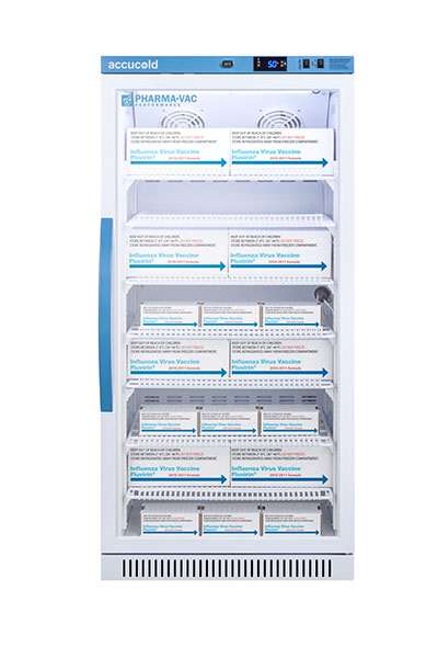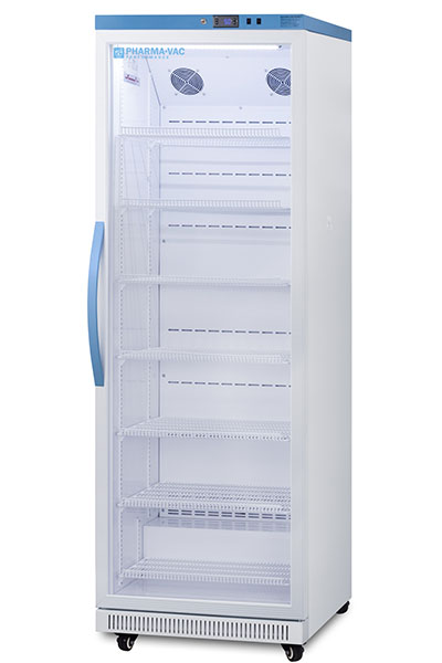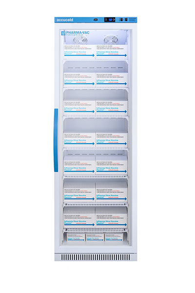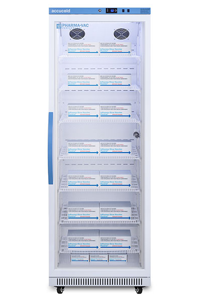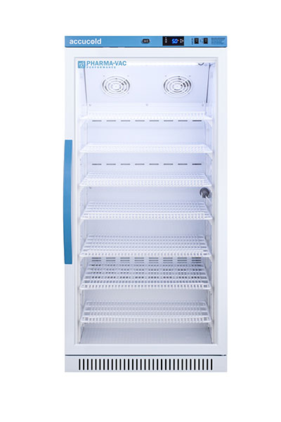 Accucold's Pharma-Vac Performance Series are upright all-refrigerators designed and purpose-built for pharmacy, medication, and vaccine applications to support meeting CDC/VFC/VFA guidelines, with a powder-coated silver ion handle that helps prevent germ spread. The ARG18PV is a 18 cu.ft. all-refrigerator with an adjustable control range from +2 to +8 degrees Celsius. The microprocessor temperature controller is externally located to minimize door openings, helping to protect stored contents from ambient temperature. The buffered temperature probe is encased in a glycol-filled bottle to better simulate temperature of the stored product, with an additional sensor that reads air temperature to ensure superior temperature control. The current and min/max temperature display is viewable in Celsius or Fahrenheit to the nearest tenth of a degree. The audible and visual temperature alarm sounds if the unit's interior goes out of range. Additional alarms include a power failure alert, door open alarm, and sensor failure alarm. This unit is equipped with remote alarm contacts in the rear and a 1/2" probe port on the right side to accept additional monitoring devices. A hospital grade cord with 'green dot' plug is also included for added safety in high traffic areas. Inside, the ARG18PV utilizes adjustable cycle defrost operation to avoid temperature spikes. Optimized forced air cooling with one internal fan ensures excellent temperature stability and uniformity with rapid recovery after door openings. The adjustable plastic-coated wire shelves can be positioned at 1/2" increments to accommodate virtually any sized item. We include seven shelves, more than competitor products providing to maximize interior shelving storage area. This unit includes LED internal lighting with an on/off rocker switch. The interior is constructed from white powder coated metal to ensure added durability and better temperature retention. The ARG18PV comes in a white cabinet finish with a blue accented control panel and user-reversible double pane tempered glass door. The factory-installed antimicrobial handle is powder-coated with naturally occurring silver ions, which help to reduce the spread of germs, allowing for a safer, cleaner user experience. This model includes a factory-installed lock and ships with two keys for staff use. Powerful magnetic gaskets ensure a positive seal. Four pre-installed 3" high casters with brakes make it easier to move as needed. Designed with hydrocarbon refrigerant, the ARG18PV provides an energy efficient solution to vaccine storage. This unit is Pyxis, Omnicell, and AcuDose RX compatible. Additional sizes, as well as solid door options, are also available. Explore the full Pharma-Vac series at accucold.com/pharmavac. NOTE: Accucold refrigerators are purpose-built to the support meeting the current CDC (Centers for Disease Control) guidelines for the storage of vaccines. Units that end in suffix "456" have been certified to the new NSF 456 standard. As referenced in the current Vaccine Storage and Handling Toolkit, these units incorporate microprocessor controls and forced air circulation for stable operation between 2 and 8 degrees Celsius. For additional temperature assurance, the CDC recommends a calibrated digital data logger (DDL), which can be added with the factory-installed option DL2B or addition of the DL2BKit accessory.