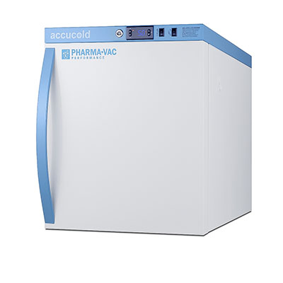Accucold's Pharma-Vac Performance Series are upright all-refrigerators designed and purpose-built for pharmacy, medication, and vaccine applications to support meeting CDC/VFC/VFA guidelines, with a powder-coated silver ion handle that helps prevent germ spread. The ARS6PV is a 6 cu.ft. all-refrigerator sized at 32.5 inches high for use in most ADA compliant applications. The adjustable control range allows you to manage the temperature between +2 to +8 degrees Celsius. The microprocessor temperature controller is externally located to minimize door openings, helping to protect stored contents from ambient temperature. The buffered temperature probe is encased in a glycol-filled bottle to better simulate temperature of the stored product, with an additional sensor that reads air temperature to ensure superior temperature control. The current and min/max temperature display is viewable in Celsius or Fahrenheit to the nearest tenth of a degree. The audible and visual temperature alarm sounds if the unit's interior goes out of range. Additional alarms include a power failure alert, door open alarm, and sensor failure alarm. This unit is equipped with remote alarm contacts in the rear and a 1/2" probe port on the right side to accept additional monitoring devices. This unit comes with a hospital grade cord with a green dot plug for added safety in high traffic areas. Inside, the ARS6PV utilizes adjustable cycle defrost operation to avoid temperature spikes. Optimized forced air cooling with one internal fan ensures excellent temperature stability and uniformity with rapid recovery after door openings. The adjustable plastic-coated wire shelves can be positioned at 1/2" increments to accommodate virtually any sized item. This unit includes LED internal lighting with an on/off rocker switch. The interior is constructed from white powder coated metal to ensure added durability and better temperature retention. The ARS6PV comes in a white cabinet finish with a blue accented control panel. The factory-installed antimicrobial handle is powder-coated with naturally occurring silver ions, which help to reduce the spread of germs, allowing for a safer, cleaner user experience. The user-reversible door ships with a right hand swing and self-closing function. This model includes a factory-installed lock and ships with two keys for staff use. Powerful magnetic gaskets ensure a positive seal. Designed with hydrocarbon refrigerant, the ARS6PV provides an energy efficient solution to vaccine storage. This unit is Pyxis, Omnicell, and AcuDose RX compatible. Additional sizes, as well as solid door options, are also available. Explore the full Pharma-Vac series at accucold.com/pharmavac. NOTE: Accucold refrigerators are purpose-built to the support meeting the current CDC (Centers for Disease Control) guidelines for the storage of vaccines. Units that end in suffix "456" have been certified to the new NSF 456 standard. As referenced in the current Vaccine Storage and Handling Toolkit, these units incorporate microprocessor controls and forced air circulation for stable operation between 2 and 8 degrees Celsius. For additional temperature assurance, the CDC recommends a calibrated digital data logger (DDL), which can be added with the factory-installed option DL2B or addition of the DL2BKit accessory.