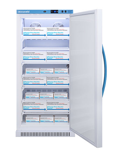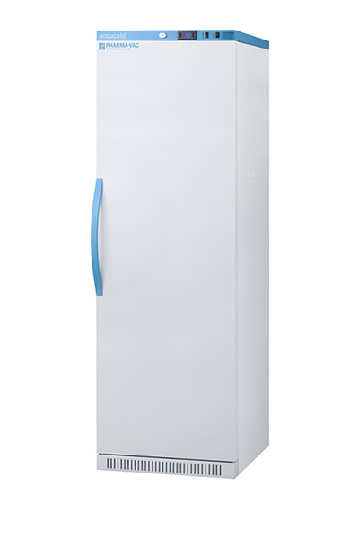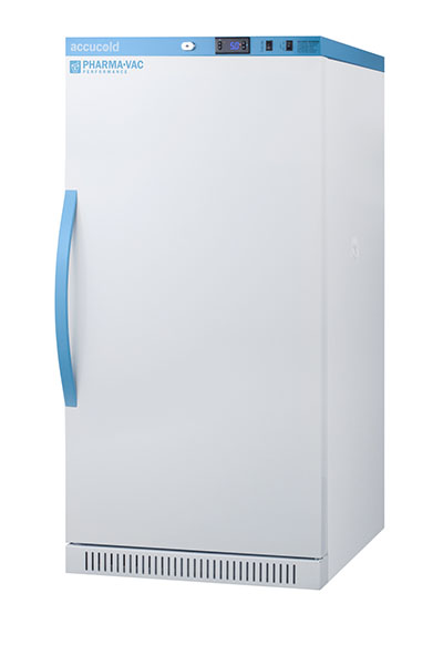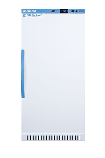 Accucold's Pharma-Vac Performance Series are upright all-refrigerators designed and purpose-built for pharmacy, medication, and vaccine applications to support meeting CDC/VFC/VFA guidelines, with a powder-coated silver ion handle that helps prevent germ spread. The ARS18PV is a 18 cu.ft. all-refrigerator with an adjustable control range from +2 to +8 degrees Celsius. The microprocessor temperature controller is externally located to minimize door openings, helping to protect stored contents from ambient temperature. The buffered temperature probe is encased in a glycol-filled bottle to better simulate temperature of the stored product, with an additional sensor that reads air temperature to ensure superior temperature control. The current and min/max temperature display is viewable in Celsius or Fahrenheit to the nearest tenth of a degree. The audible and visual temperature alarm sounds if the unit's interior goes out of range. Additional alarms include a power failure alert, door open alarm, and sensor failure alarm. This unit is equipped with remote alarm contacts in the rear and a 1/2" probe port on the right side to accept additional monitoring devices. A hospital grade cord with 'green dot' plug is also included for added safety in high traffic areas. Inside, the ARS18PV utilizes adjustable cycle defrost operation to avoid temperature spikes. Optimized forced air cooling with one internal fan ensures excellent temperature stability and uniformity with rapid recovery after door openings. The adjustable plastic-coated wire shelves can be positioned at 1/2" increments to accommodate virtually any sized item. We include seven shelves, more than competitor products providing to maximize interior shelving storage area. This unit includes LED internal lighting with an on/off rocker switch. The interior is constructed from white powder coated metal to ensure added durability and better temperature retention. The ARS18PV comes in a white exterior finish with a blue accented control panel and user-reversible door. The factory-installed antimicrobial handle is powder-coated with naturally occurring silver ions, which help to reduce the spread of germs, allowing for a safer, cleaner user experience. This model includes a factory-installed lock and ships with two keys for staff use. Powerful magnetic gaskets ensure a positive seal. Four pre-installed 3" high casters with brakes make it easier to move as needed. Designed with hydrocarbon refrigerant, the ARS18PV provides an energy efficient solution to vaccine storage. This unit is Pyxis, Omnicell, and AcuDose RX compatible. Additional sizes, as well as glass door options, are also available. Explore the full Pharma-Vac series at accucold.com/pharmavac. NOTE: Accucold refrigerators are purpose-built to the support meeting the current CDC (Centers for Disease Control) guidelines for the storage of vaccines. Units that end in suffix "456" have been certified to the new NSF 456 standard. As referenced in the current Vaccine Storage and Handling Toolkit, these units incorporate microprocessor controls and forced air circulation for stable operation between 2 and 8 degrees Celsius. For additional temperature assurance, the CDC recommends a calibrated digital data logger (DDL), which can be added with the factory-installed option DL2B or addition of the DL2BKit accessory.