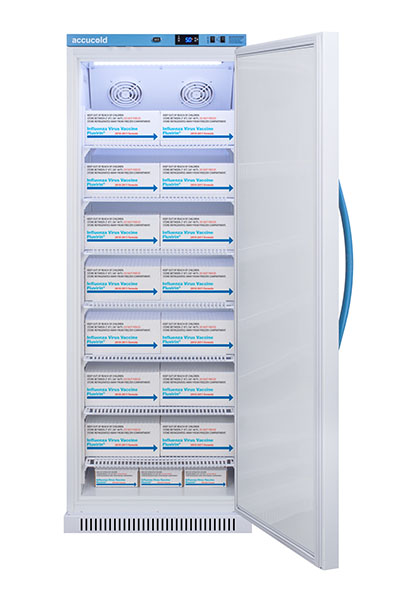 Accucold's Pharma-Vac Performance Series are upright all-refrigerators designed and purpose-built for pharmacy, medication, and vaccine applications to support meeting CDC/VFC/VFA guidelines, with a powder-coated silver ion handle that helps prevent germ spread. The ARS12PV is a 12 cu.ft. all-refrigerator with an adjustable control range from +2 to +8 degrees Celsius. The microprocessor temperature controller is externally located to minimize door openings, helping to protect stored contents from ambient temperature. The buffered temperature probe is encased in a glycol-filled bottle to better simulate temperature of the stored product, with an additional sensor that reads air temperature to ensure superior temperature control. The current and min/max temperature display is viewable in Celsius or Fahrenheit to the nearest tenth of a degree. The audible and visual temperature alarm sounds if the unit's interior goes out of range. Additional alarms include a power failure alert, door open alarm, and sensor failure alarm. This unit is equipped with remote alarm contacts in the rear and a 1/2" probe port on the right side to accept additional monitoring devices. A hospital grade cord with 'green dot' plug is also included for added safety in high traffic areas. Inside, the ARS12PV utilizes adjustable cycle defrost operation to avoid temperature spikes. Optimized forced air cooling with one internal fan ensures excellent temperature stability and uniformity with rapid recovery after door openings. The adjustable plastic-coated wire shelves can be positioned at 1/2" increments to accommodate virtually any sized item. We include seven shelves, more than competitor products providing to maximize interior shelving storage area. This unit includes LED internal lighting with an on/off rocker switch. The interior is constructed from white powder coated metal to ensure added durability and better temperature retention. The ARS12PV comes in a white cabinet finish with a blue accented control panel. The user-reversible door comes with a factory-installed antimicrobial handle that is powder-coated with naturally occurring silver ions, which help to reduce the spread of germs, allowing for a safer, cleaner user experience. This model also includes a factory-installed lock and ships with two keys for staff use. Powerful magnetic gaskets ensure a positive seal. Designed with hydrocarbon refrigerant, the ARS12PV provides an energy efficient solution to vaccine storage. This unit is Pyxis, Omnicell, and AcuDose RX compatible. Additional sizes, as well as solid door options, are also available. Explore the full Pharma-Vac series at accucold.com/pharmavac. NOTE: Accucold refrigerators are purpose-built to the support meeting the current CDC (Centers for Disease Control) guidelines for the storage of vaccines. Units that end in suffix "456" have been certified to the new NSF 456 standard. As referenced in the current Vaccine Storage and Handling Toolkit, these units incorporate microprocessor controls and forced air circulation for stable operation between 2 and 8 degrees Celsius. For additional temperature assurance, the CDC recommends a calibrated digital data logger (DDL), which can be added with the factory-installed option DL2B or addition of the DL2BKit accessory.