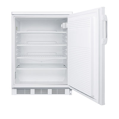 Accucold by Summit Appliance offers a wide range of all-refrigerators for general purpose storage. The commercially listed FF7 Series features high performing, perfectly sized all-refrigerators designed for freestanding use. The FF7LW is a counter height all-refrigerator with a full 5.5 cu.ft. capacity inside a slim 24" footprint. Designed for freestanding use, this model has a white exterior and user-reversible door swing. A factory installed front lock offers convenient security. Inside, the FF7LW utilizes low maintenance automatic defrost operation. Our unique "hidden" evaporator is set behind the rear wall to create a seamless, easy-to-clean interior that also maximizes shelf space. This unit has a flat door liner that allows it to accept larger trays (up to 19 1/2" x 16"). Adjustable wire shelves allow users to reconfigure the interior to accommodate a variety of sizes. The interior light is controlled by an on/off rocker switch located behind the thermostat dial. The FF7LW is ETL-S listed to NSF-7 standards for use in commercial establishments. For a built-in version of this unit, see the FF7BI. For more finish options, browse the entire FF7 Series. NOTE: This unit is designed for general purpose or commercial applications and does not meet DOE energy standards for residential use.