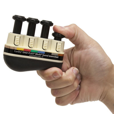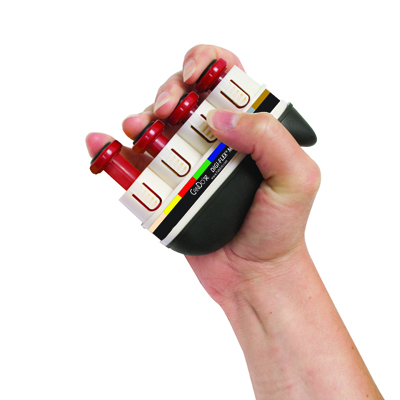 Use each button independently to exercise fingers or compress the entire unit for complete hand and forearm strengthening. Change resistance for any finger by changing the finger button. Finger buttons snap into frame with ease. Frame has padded ergonomic palm bar. There are 8 levels of finger buttons available: tan (xx-light), yellow (x-light), red (light), green (medium), blue (heavy), black (x-heavy), silver (xx-heavy), gold (xxx-heavy). Clinic hand therapy and home exerciser kits, as well as individual components available.