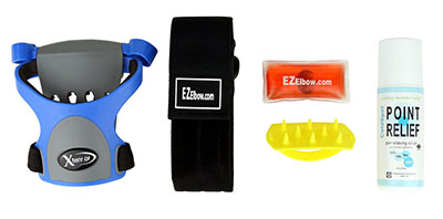 Compression wrap for elbow may be used alone or in conjunction with the treatment protocol. The EZ Elbow system has a handy pocket for re-usable hot pack or spike plates. These small accessories and the unit fit in a convenient case. Spike plates can also be worn in hand to apply massage. Various kits available that also include arm exercisers and topical analgesics!