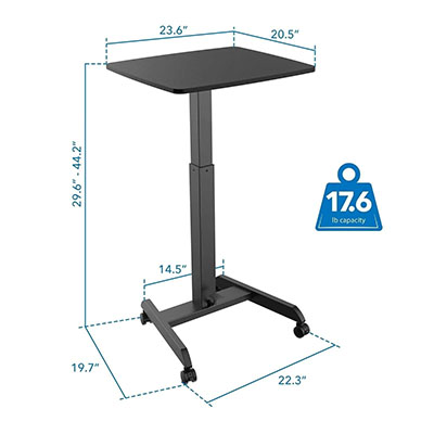 This portable desk offers an easy way to set up and position your computer or A/V equipment. The locking casters provide mobility, and the tilt feature gives you the ability to adjust your equipment to an ideal position. The gas spring makes adjustments up and down a breeze. Enjoy this well built, sturdy stand for years to come.